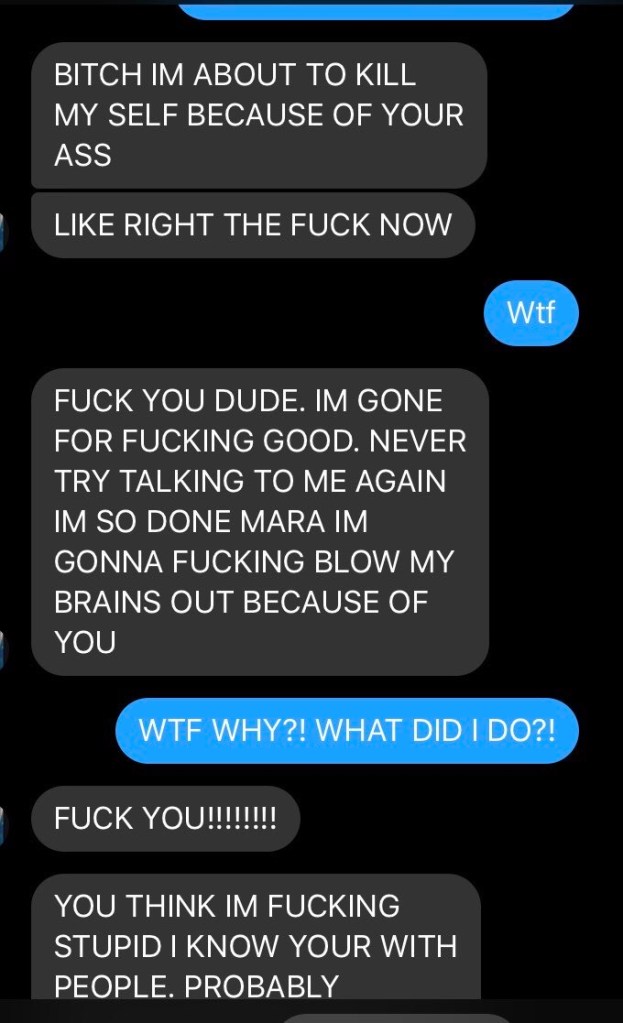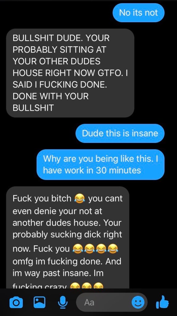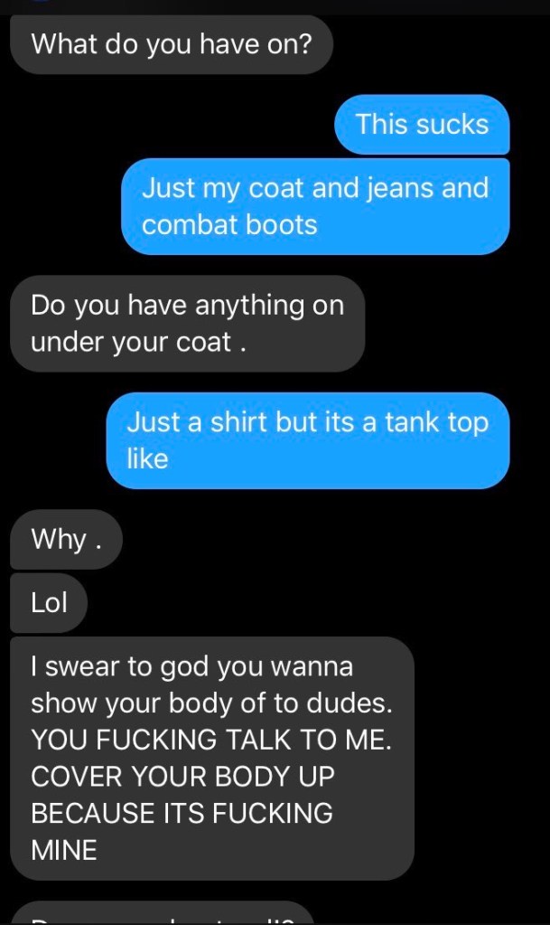 I was 14-16 years old when I was with him. Remind you, these texts were from when I was either sleeping, with family, or at work. I was accused of cheating, when I never did. (He was also the only man I had ever slept with at the time). I was threatened with a gun he owned, and cheated on by him. He would make me send photos to him of where I was just to prove it to him. I wasn’t allowed friends of either sex. He once broke up with me for seeing a movie with my step dad. I couldn’t wear tank tops or show my shoulders or belly. On Halloween one year, he drugged me, raped me, and then cried because I was shaking so bad and my eyes were red and I thought I was having a seizure. I threw up eight times that night. It took a lot out of me to end this relationship, but it helped me grow as a person and learn, and truly, I hope the best for him and that he gets better.