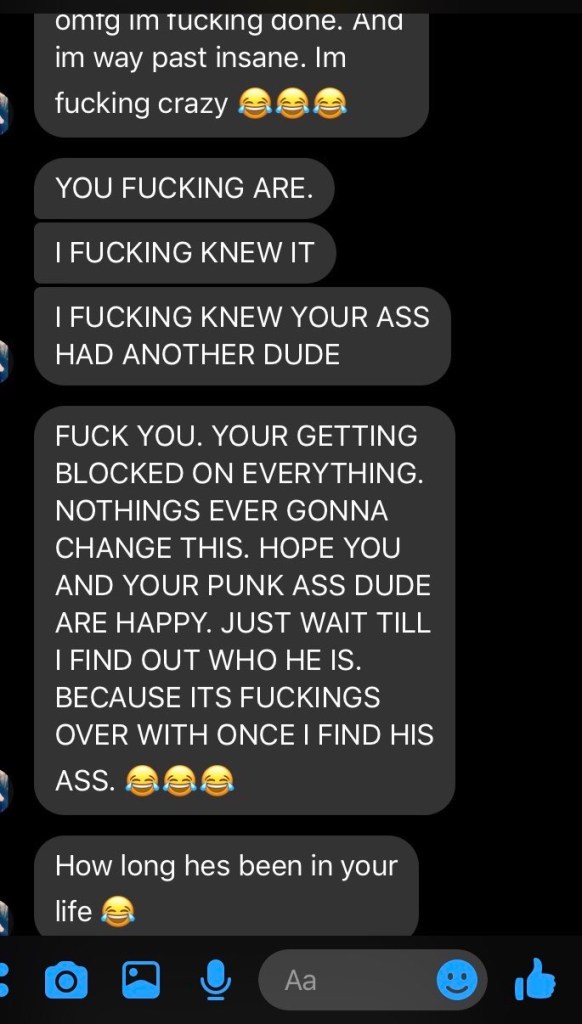 In the images below, there are texts from that person from when we were not together, but I was still to scared to cut him off. This is what I endured, yet still couldn’t call it abuse. If a man says these things to you, it is ABUSE. Warning for below photos, as they are vulgar and depict abuse.